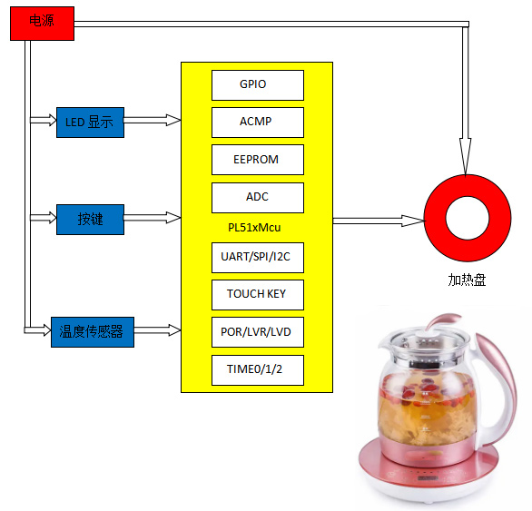 一、PL51T020 养生水壶方案性能特点: